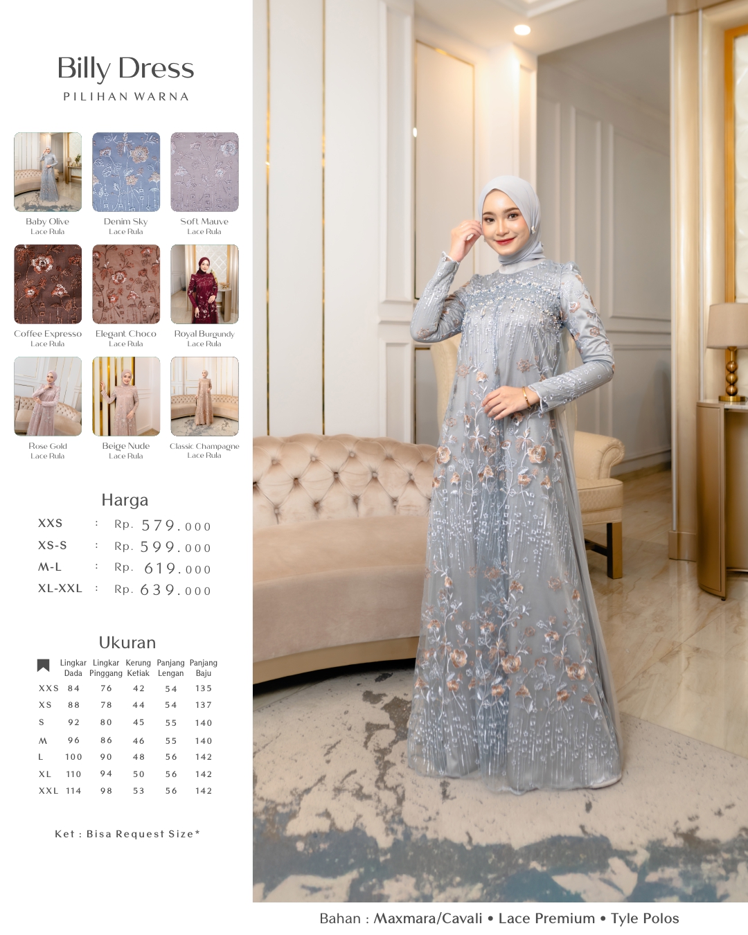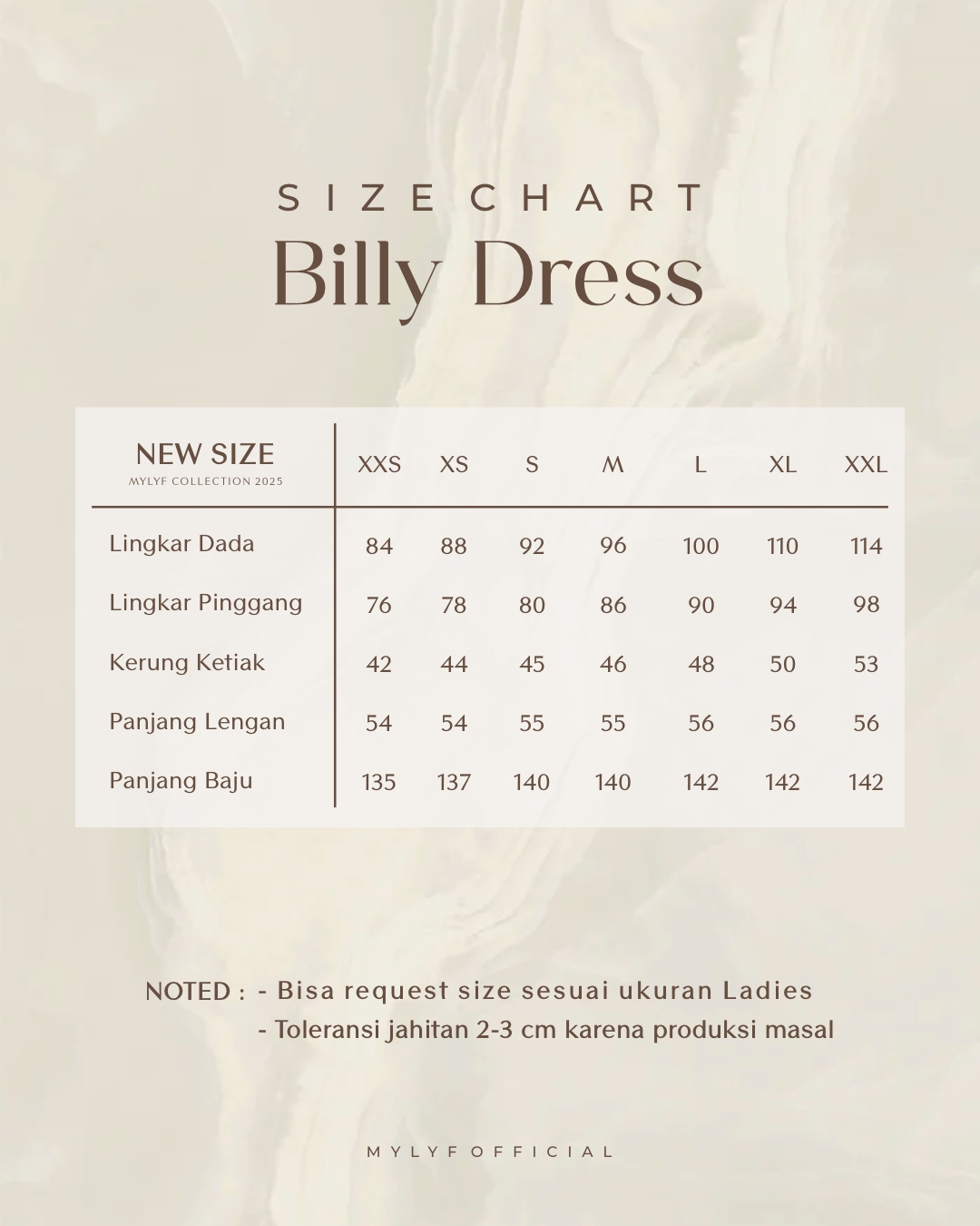 REQUEST SIZE DRESS : 1. LINGKAR DADA : 2. LINGKAR PINGGANG : 3. PANJANG BAJU : 4. PANJANG TANGAN : 5. KERUNG KETIAK / KERUNG LENGAN : 6. LINGKAR LENGAN ATAS : 📌 Noted : WAJIB mengisi semua nomer, apabila ada yang tidak diisi (ukuran otomatis mengikuti standar kami) dan jika ternyata tidak sesuai mohon maaf tidak bisa direfund 🙏