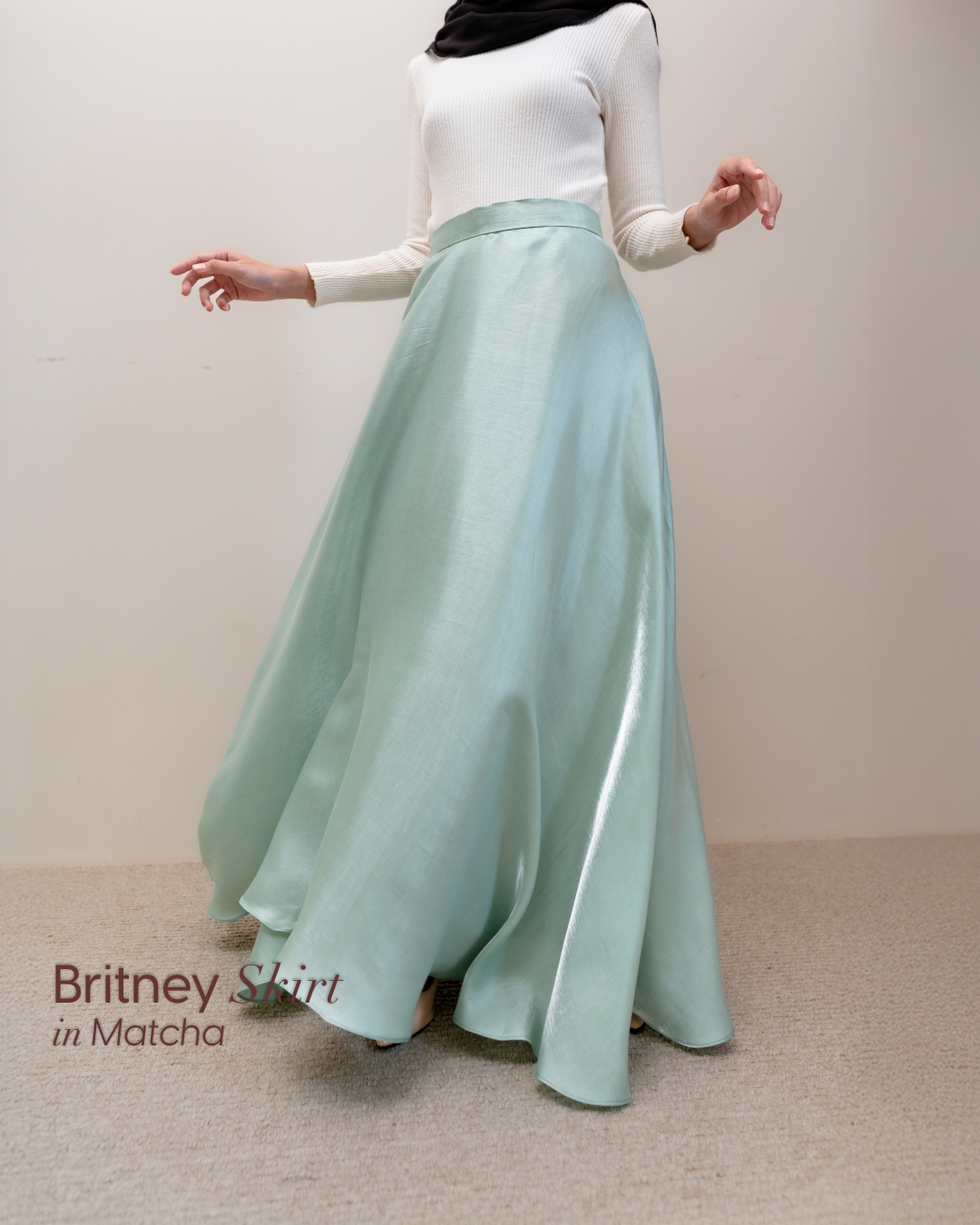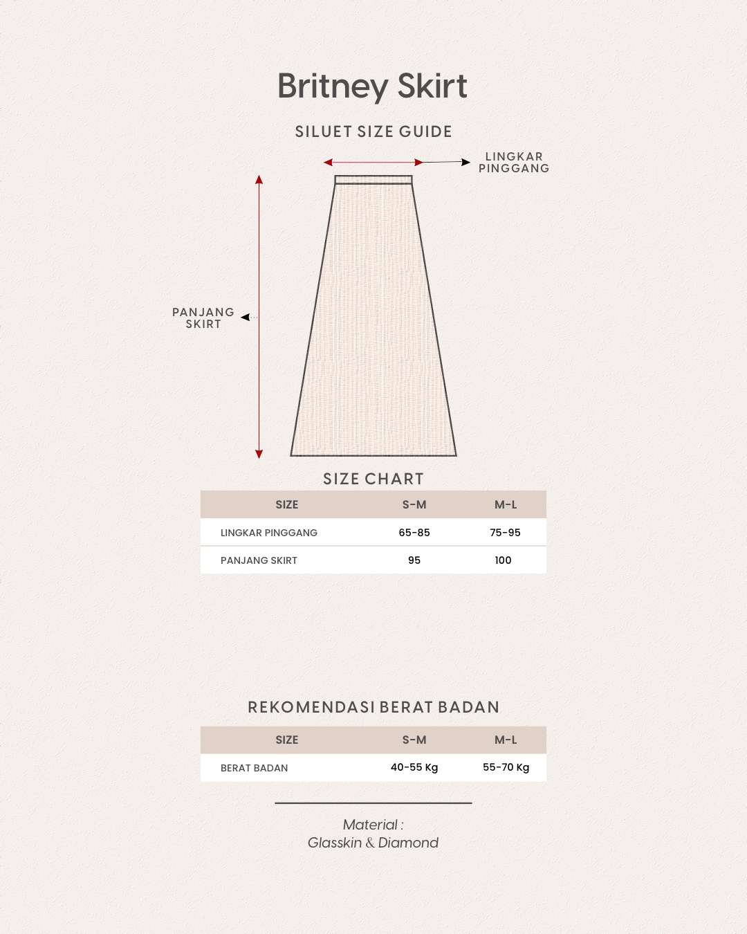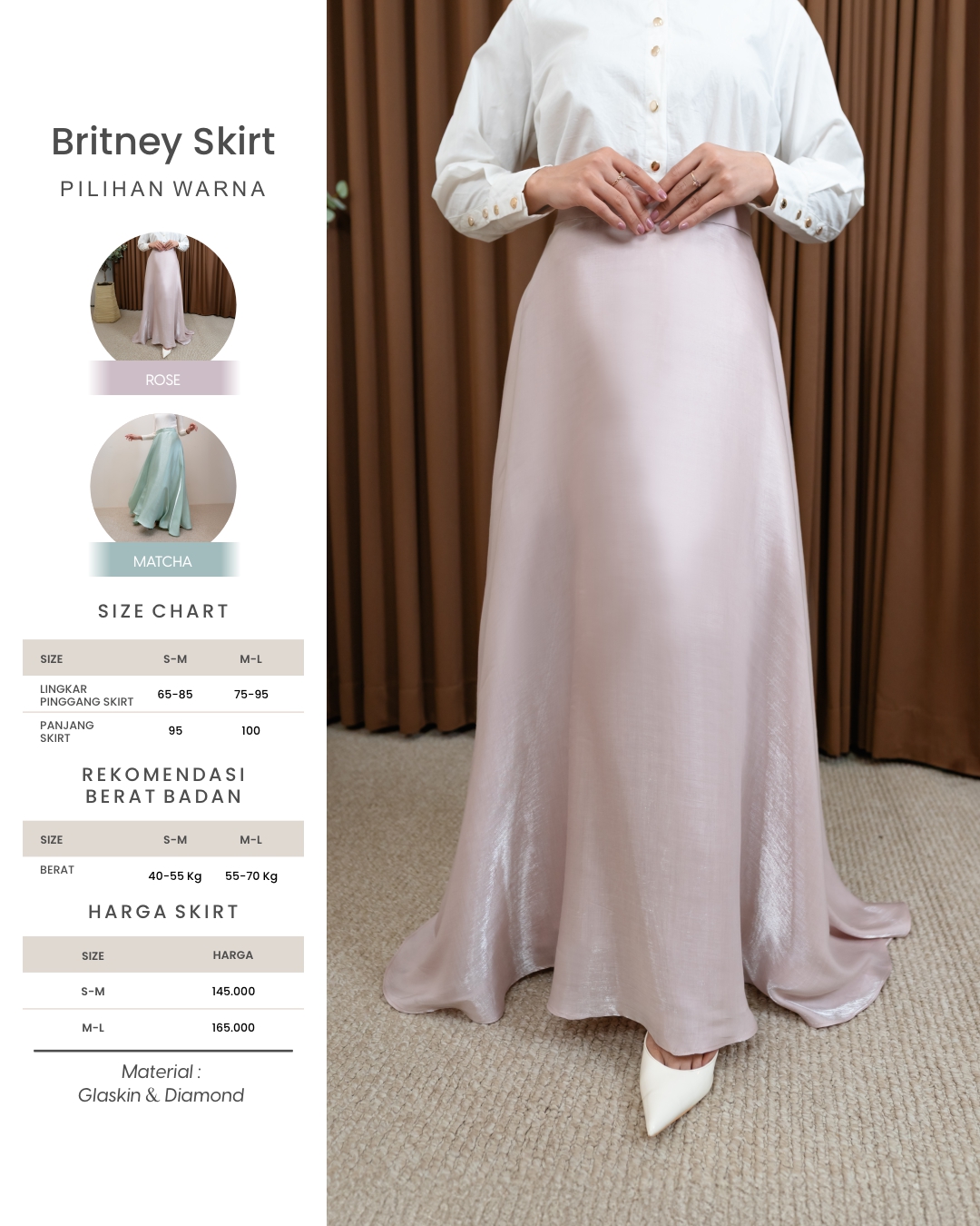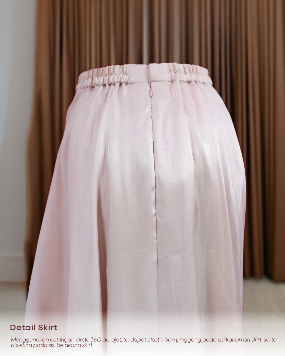 Terdapat elastik dan pinggang pada sisi kanan kiri skirt dan resleting pada sisi belakang skirt