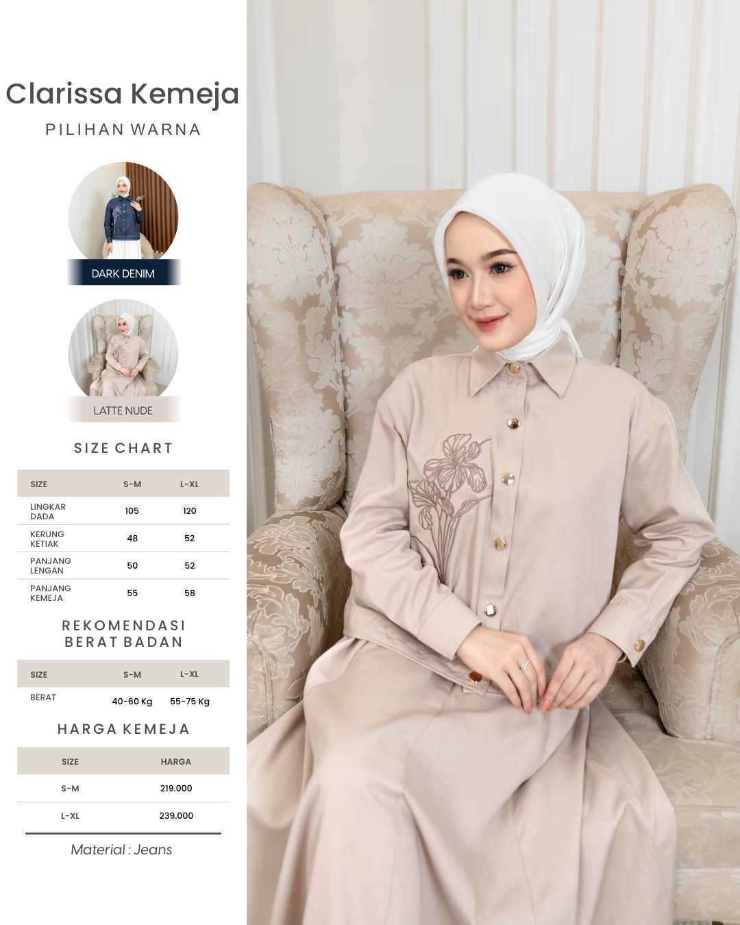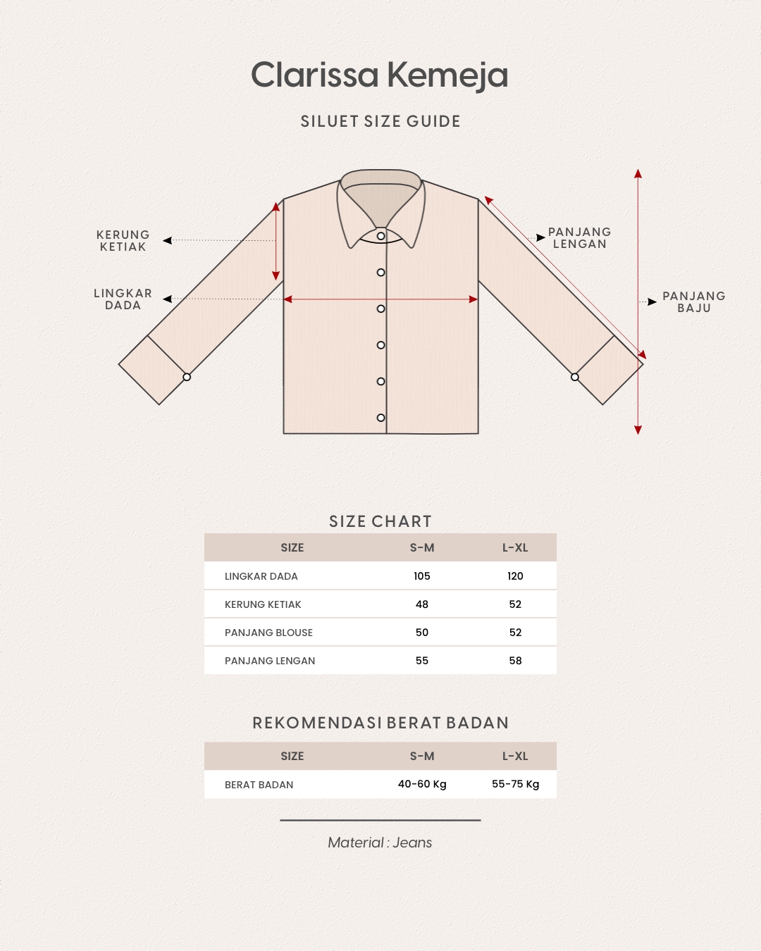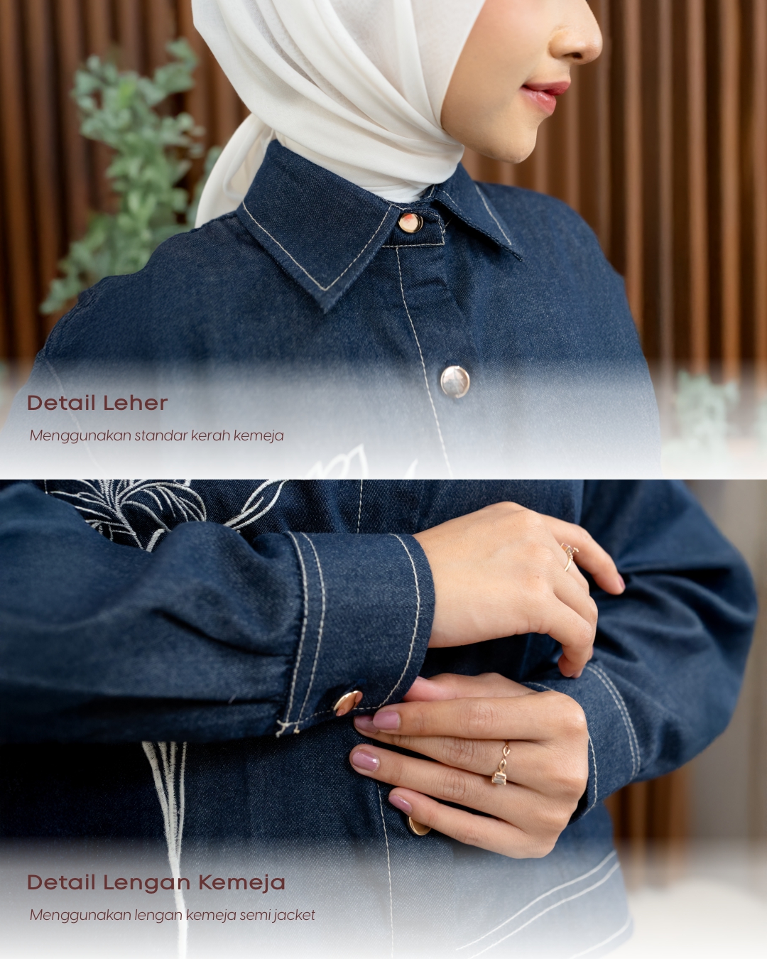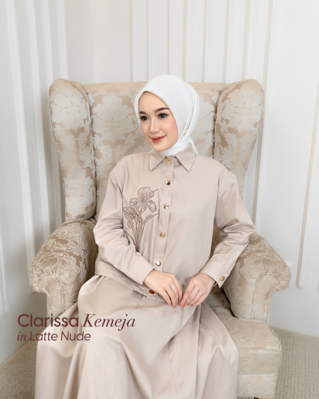 Menggunakan kancing exclusive gold pada bukaan tengah muka dan kupnat pada bagian depan Kemeja Clarissa