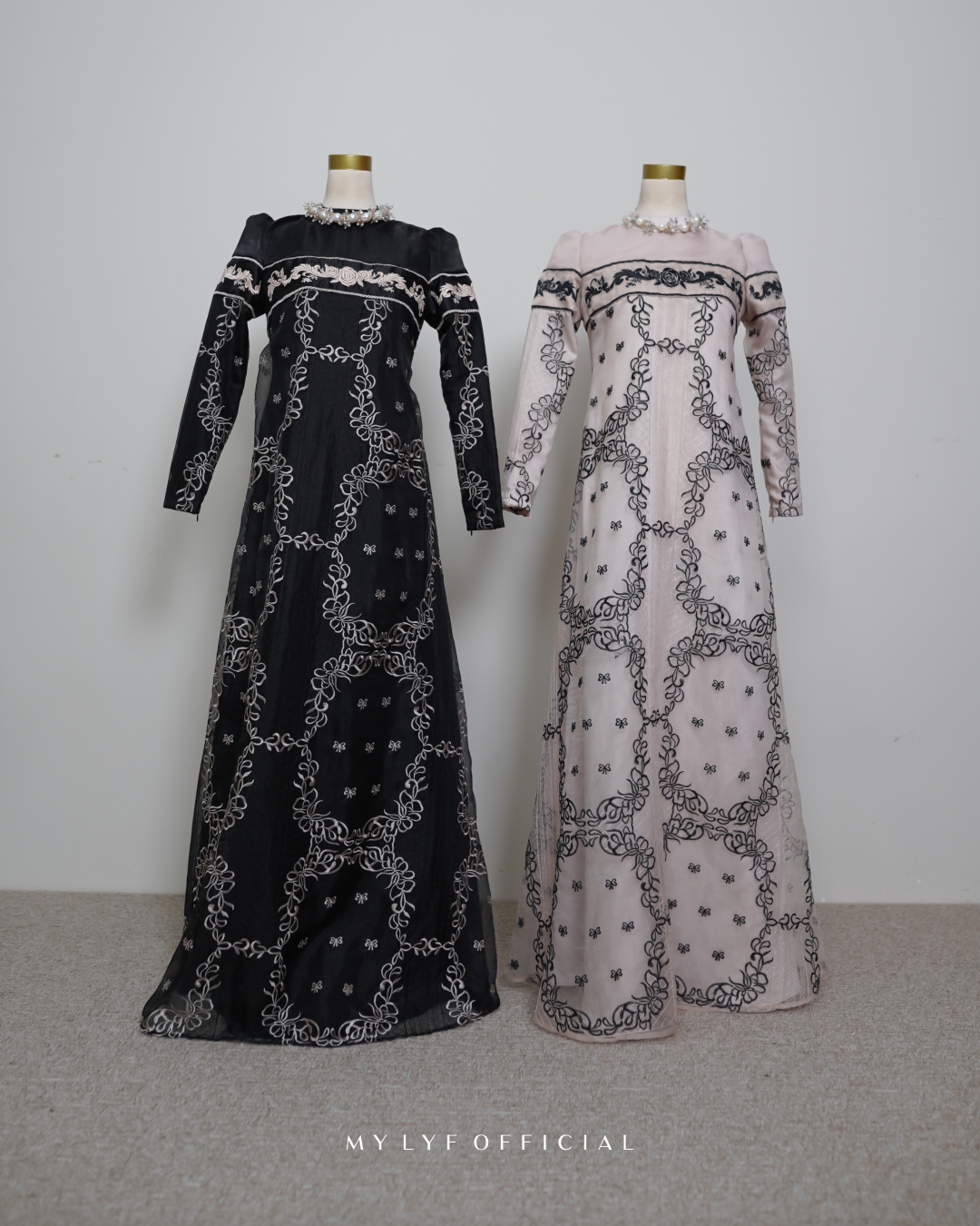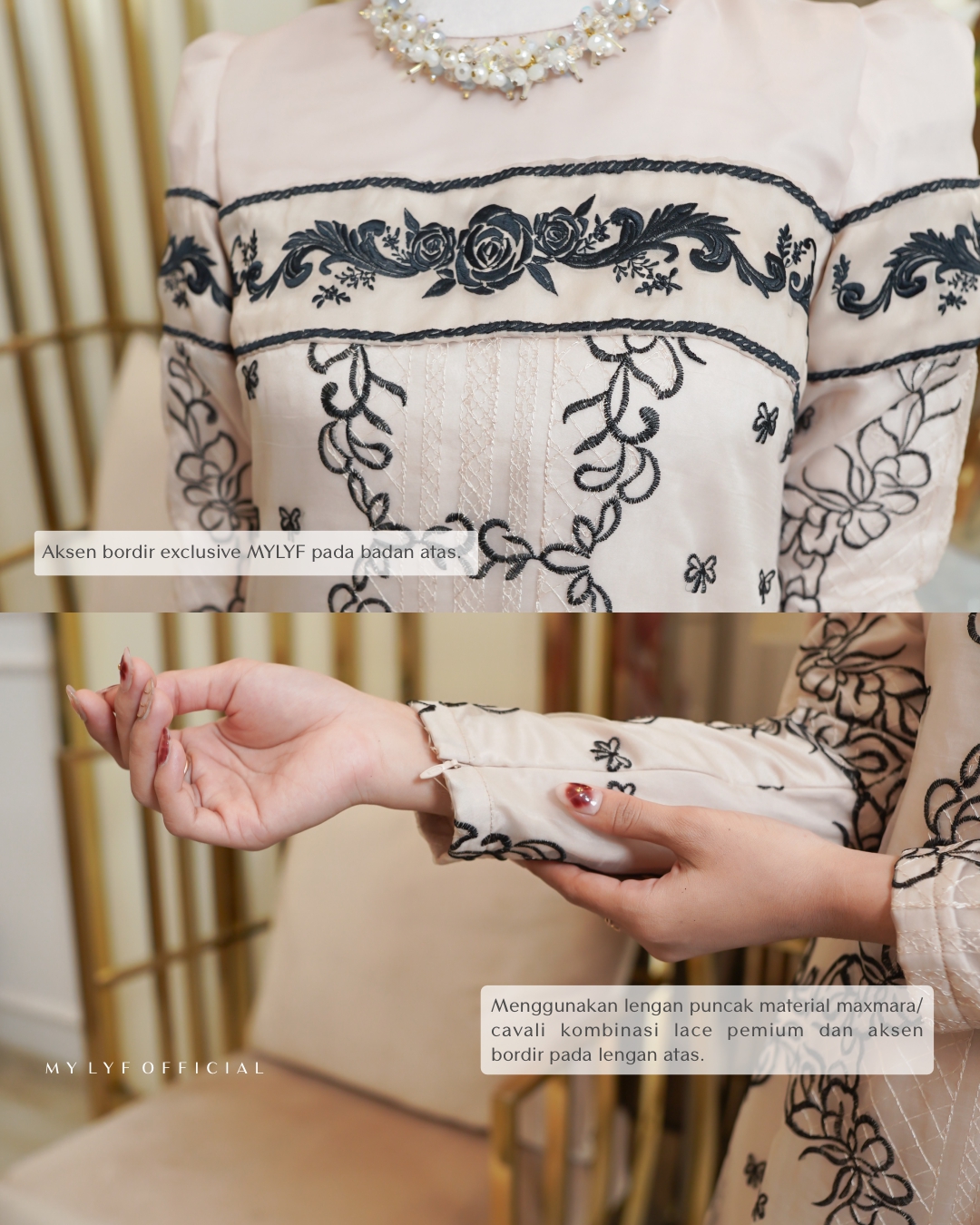 • Menggunakan material maxmara/cavali kombinasi lace premium, organza dan aksen bordir exclusive MYLYF pada badan atas dress Dira