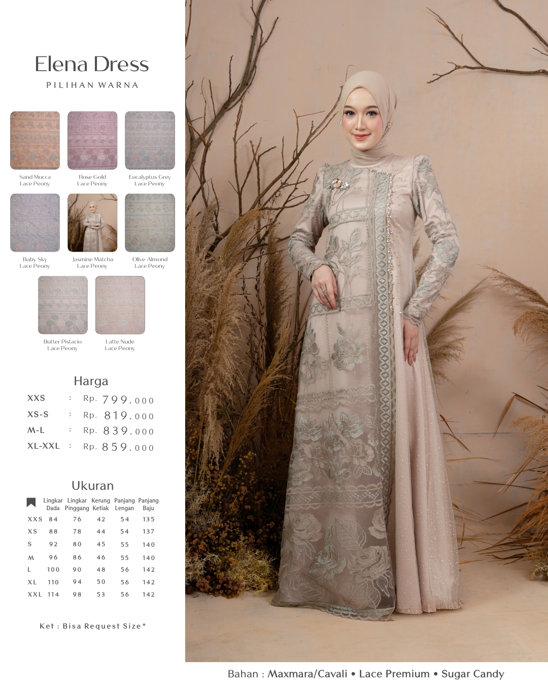 REQUEST SIZE DRESS : 1. LINGKAR DADA : 2. LINGKAR PINGGANG : 3. PANJANG BAJU : 4. PANJANG TANGAN : 5. KERUNG KETIAK / KERUNG LENGAN : 6. LINGKAR LENGAN ATAS : 📌 Noted : WAJIB mengisi semua nomer, apabila ada yang tidak diisi (ukuran otomatis mengikuti standar kami) dan jika ternyata tidak sesuai mohon maaf tidak bisa direfund 🙏