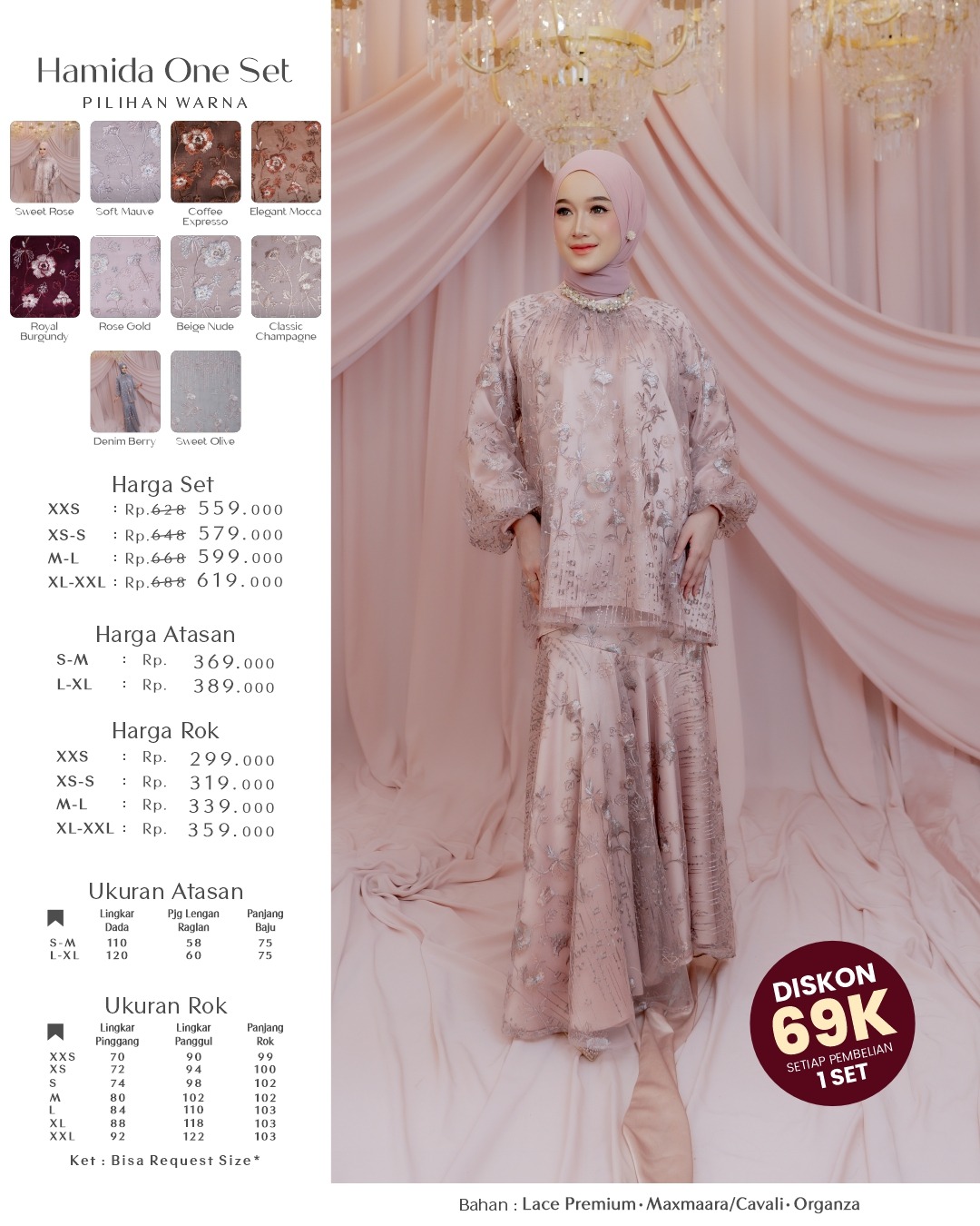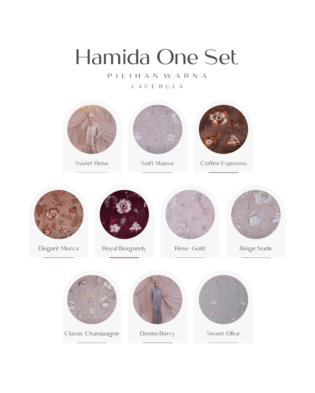 CLASSIC CHAMPAGNE, SOFT MAUVE, DENIM BERRY, SWEET ROSE, COFFE EXPRESSO, ELEGANT CHOCO, ROYAL BURGUNDY