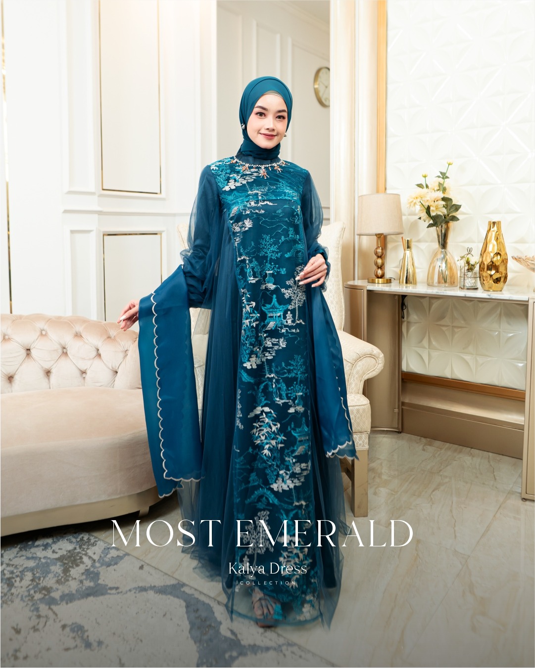 Terdapat hiasan payet exclusive MYLYF pada garis leher dress Kalya