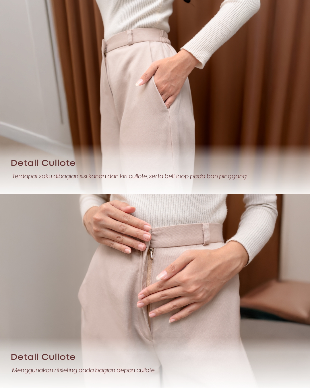 Menggunakan resleting pada bagian depan cullote