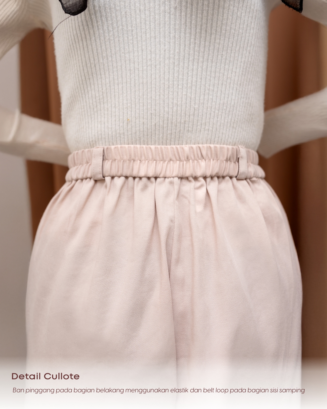 Terdapat ban pinggang pada bagian belakang dengan elastik dan belt loop pada bagian sisi samping
