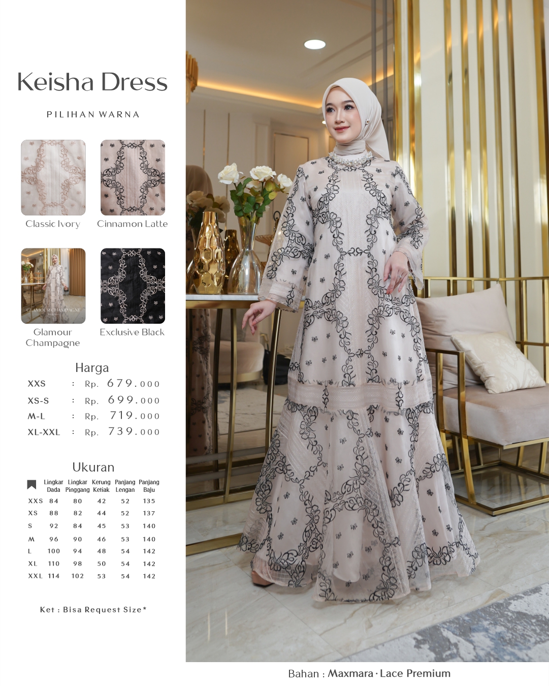 • Menggunakan material maxmara/cavali kombinasi lace premium dan tyle polos dengan variasi cutting melebar pada badan bawah dress Keisha