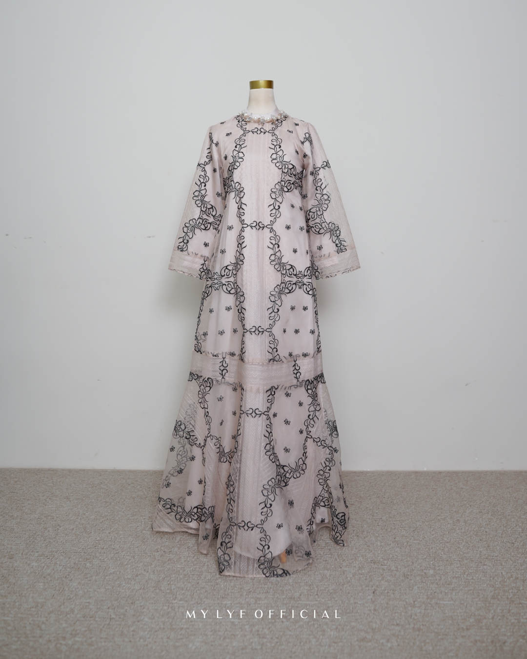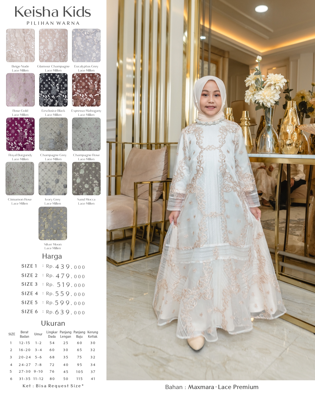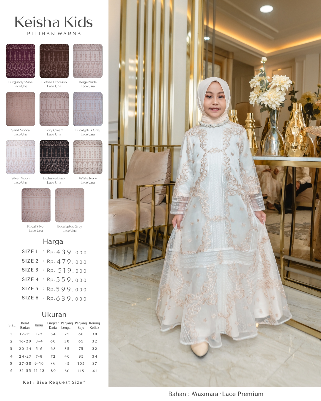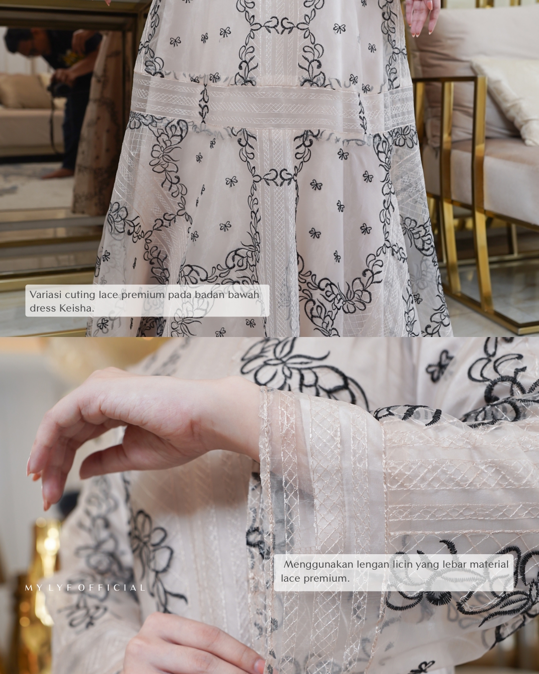 • Menggunakan material maxmara/cavali kombinasi lace premium dan tyle polos dengan variasi cutting melebar pada badan bawah dress Keisha