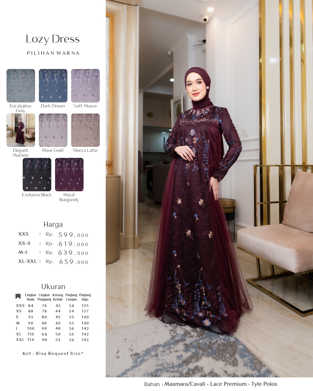 • Menggunakan materimal maxmara/cavali kombinasi lace premium dan tyle polos