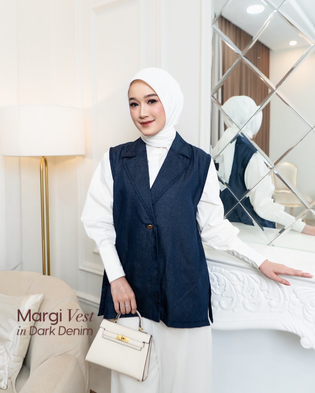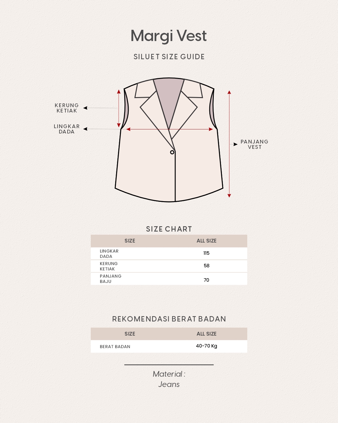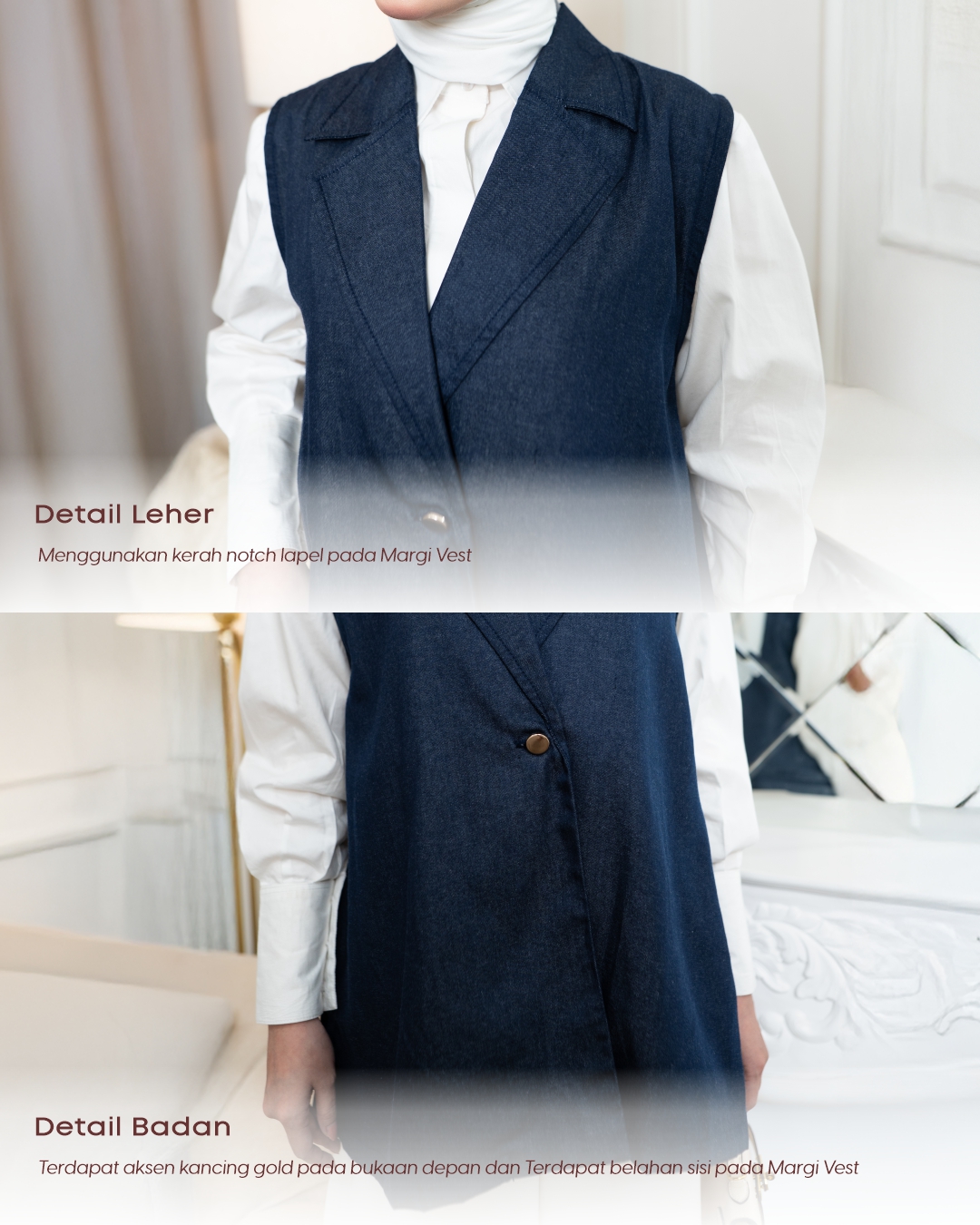 Terdapat aksen kancing gold pada bukaan depan dan terdapat belahan sisi pada Margi Vest