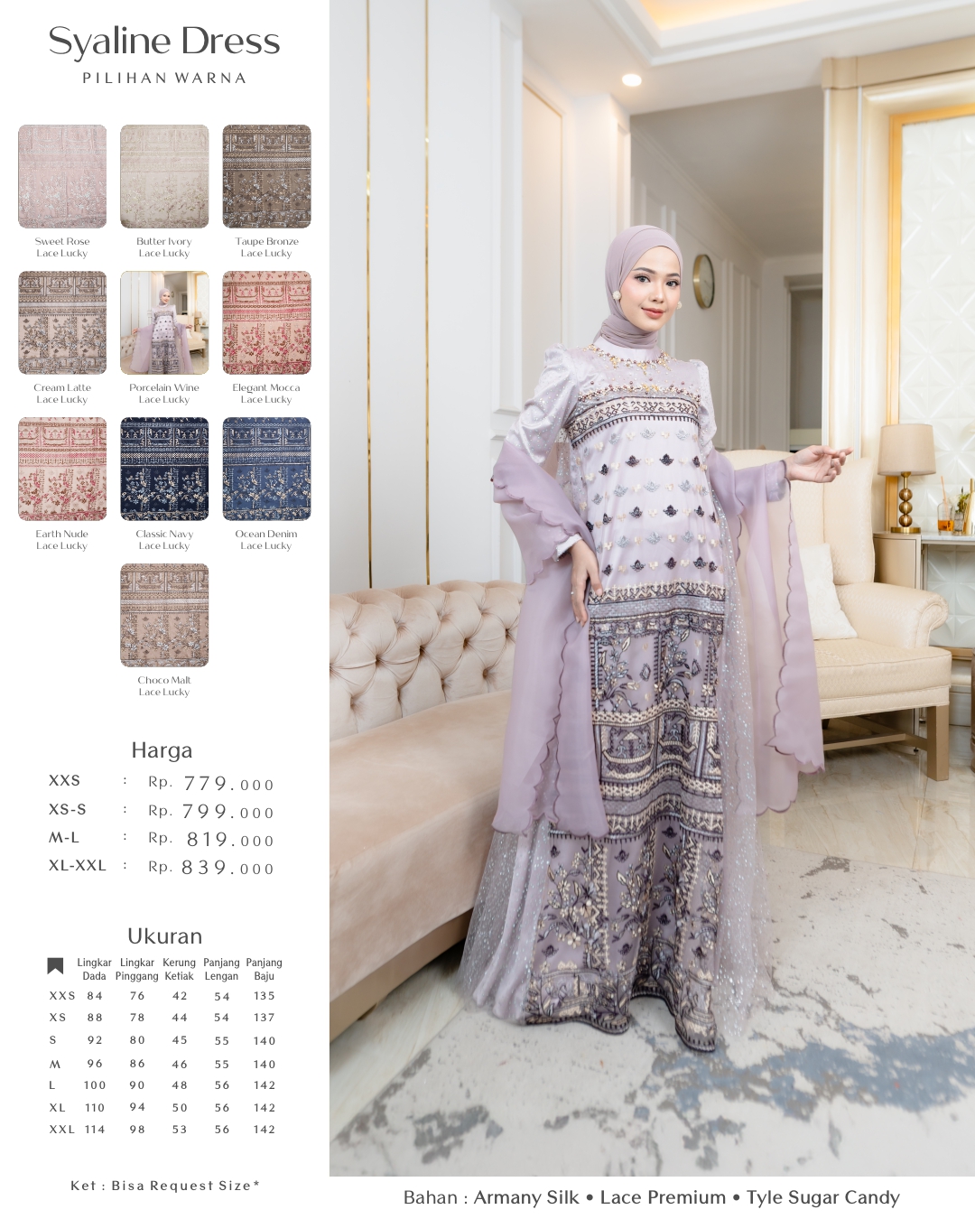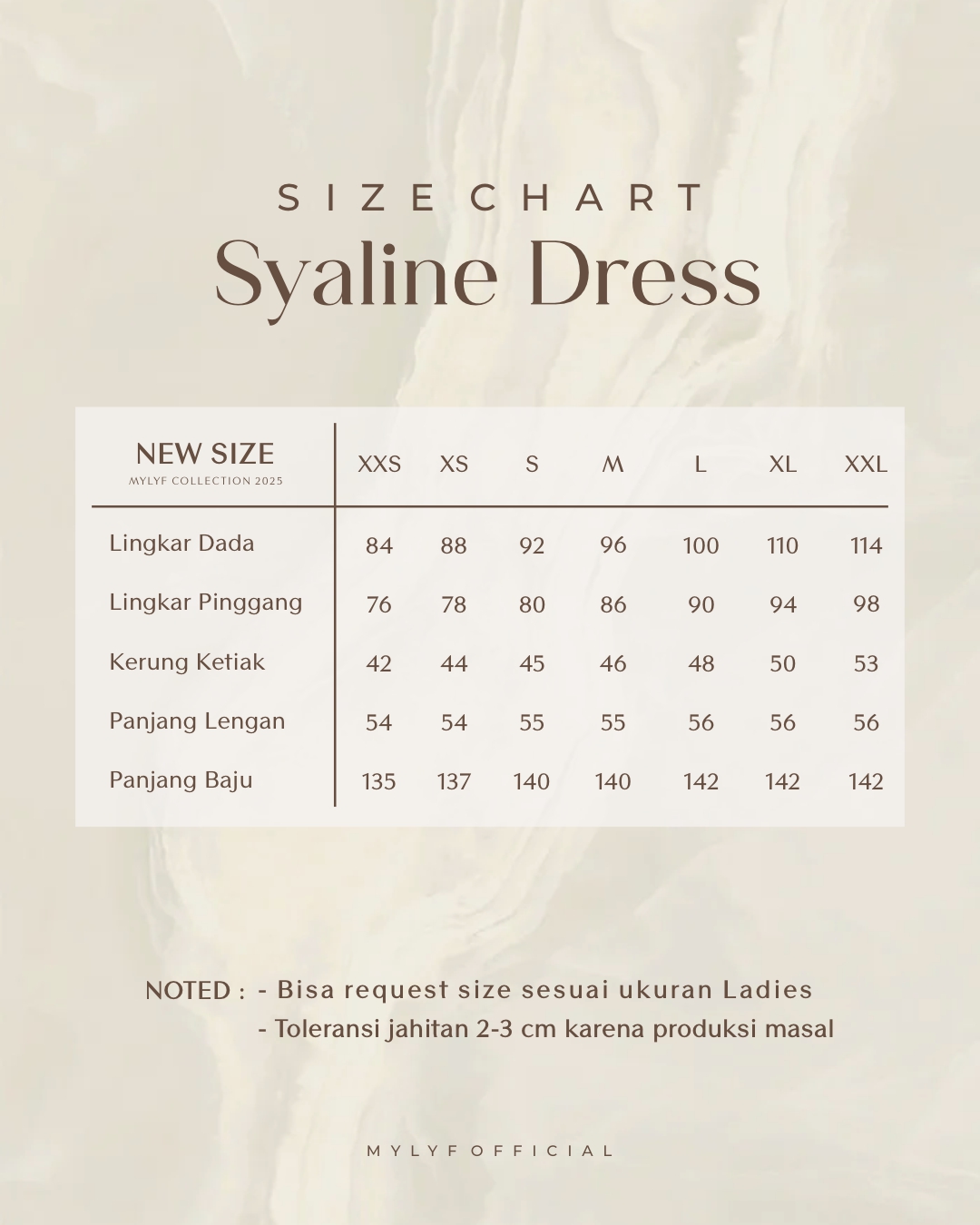REQUEST SIZE DRESS : 1. LINGKAR DADA : 2. LINGKAR PINGGANG : 3. PANJANG BAJU : 4. PANJANG TANGAN : 5. KERUNG KETIAK / KERUNG LENGAN : 6. LINGKAR LENGAN ATAS : 📌 Noted : WAJIB mengisi semua nomer, apabila ada yang tidak diisi (ukuran otomatis mengikuti standar kami) dan jika ternyata tidak sesuai mohon maaf tidak bisa direfund 🙏