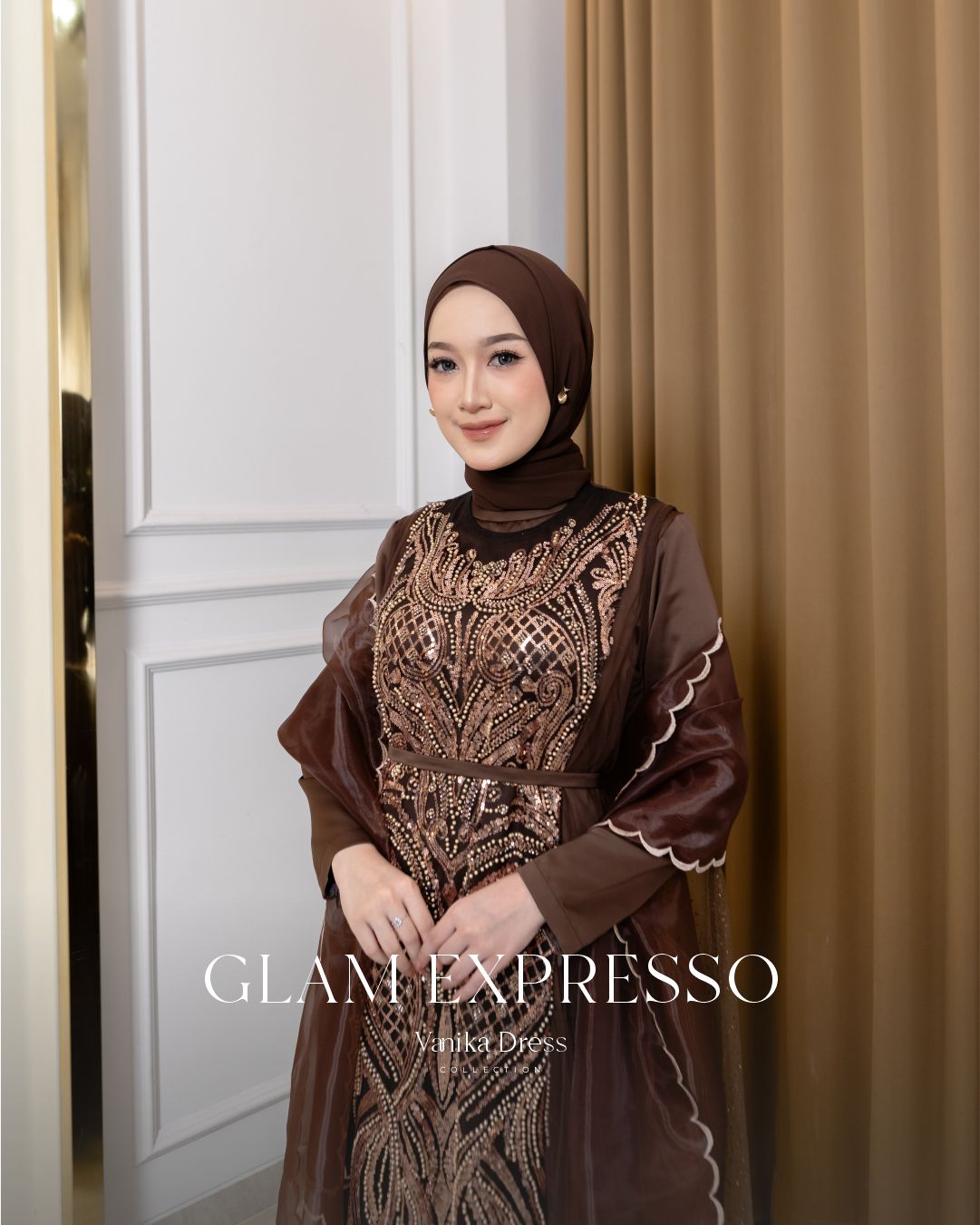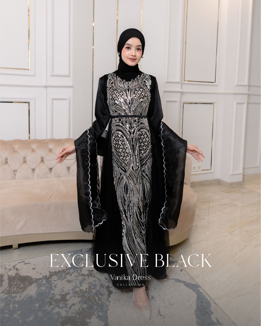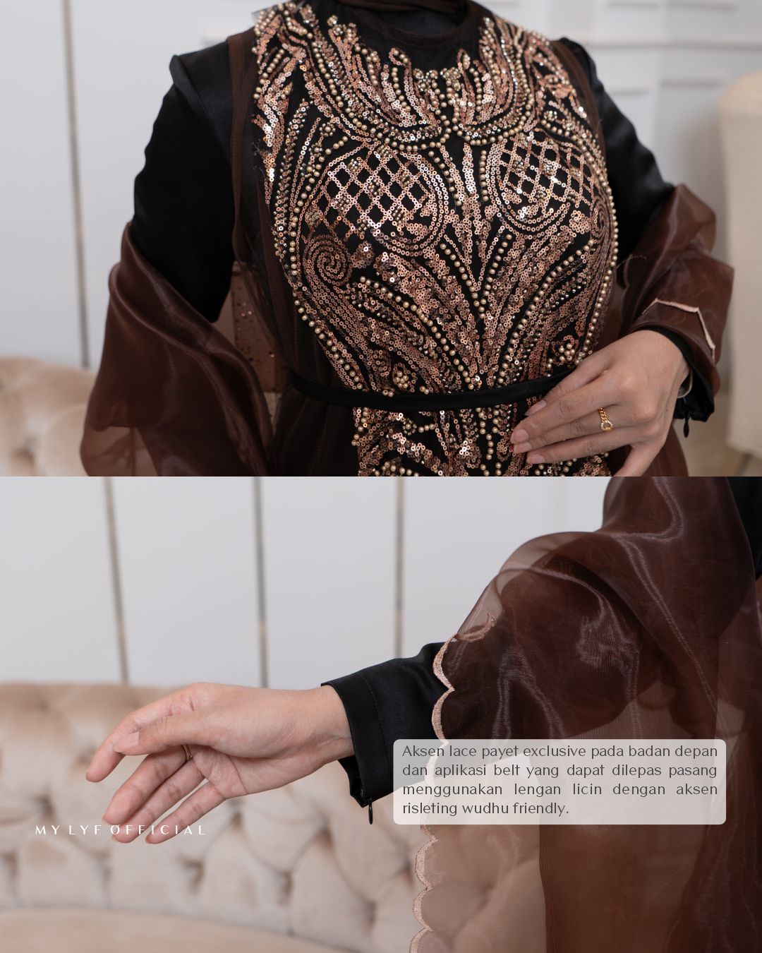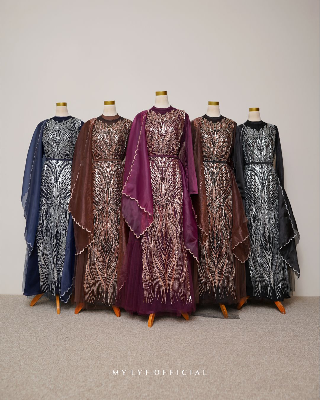 Menggunakan material maxmara tyle polos kombinasi lace payet exclusive pada badan dan aksen layer tyle sugar candy pada badan belakang Outer Vanika